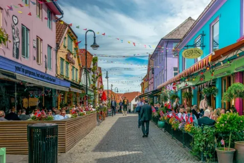 Et besøg i Øvre Holmegate, også kendt som Fargegatan, er næsten et must. Den farverige gade er kendt for sine karakteristiske facader, små specialbutikker, caféer og barer og er et af Stavangers mest fotograferede områder. Langs havneområdet ved Vågen finder I desuden et godt udvalg af spisesteder og butikker.