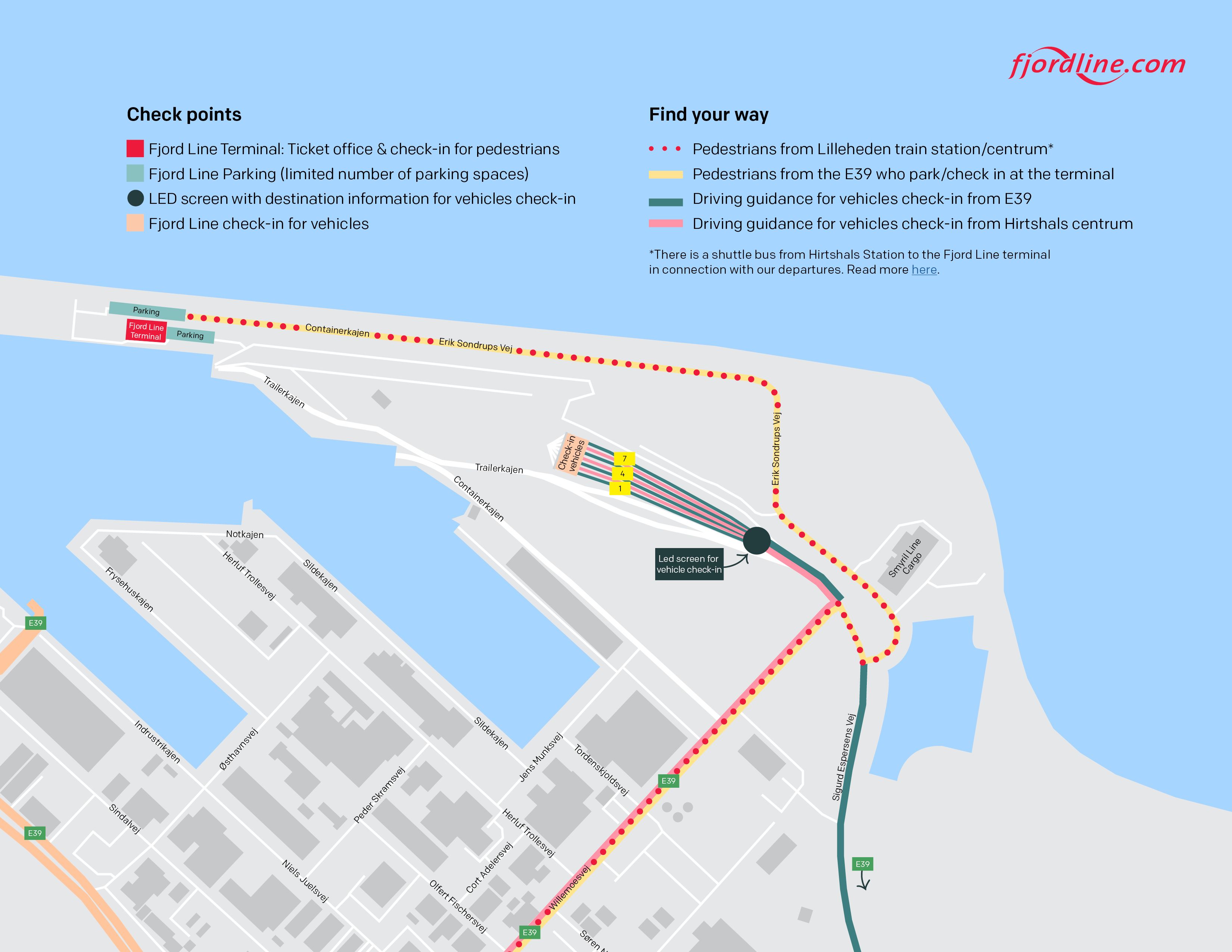To make your travel experience easier, we have created a map of Hirtshals port. Whether you are on foot or driving, this map will help you find the way to the check-in location.