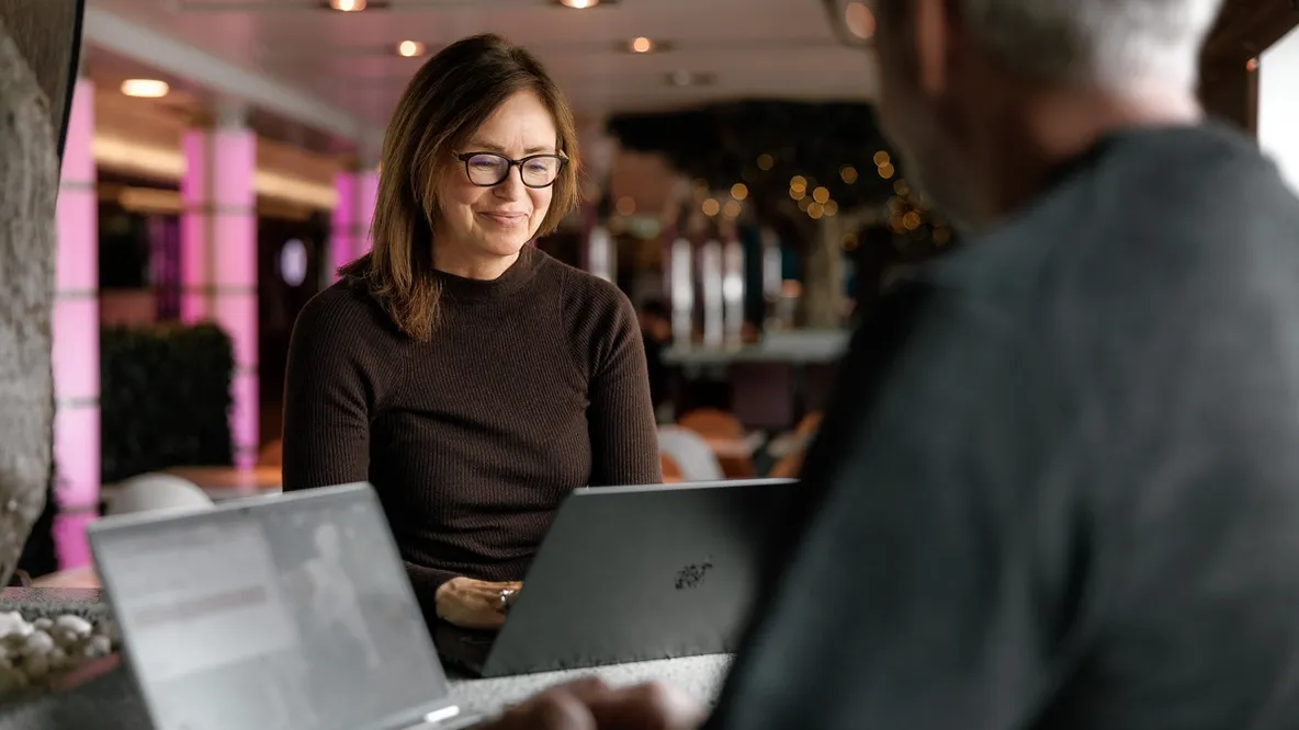 På våre skip finner du behagelige lounger der det er enkelt å få jobbet mens du reiser. Her sitter du komfortabelt, har tilgang til strømuttak og wifi og kan også bestille mat og drikke.